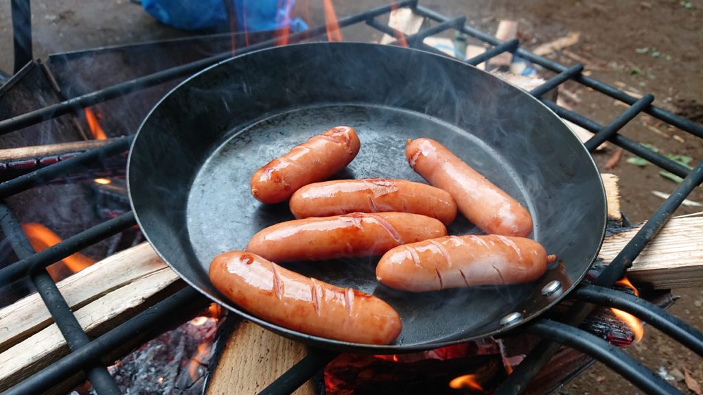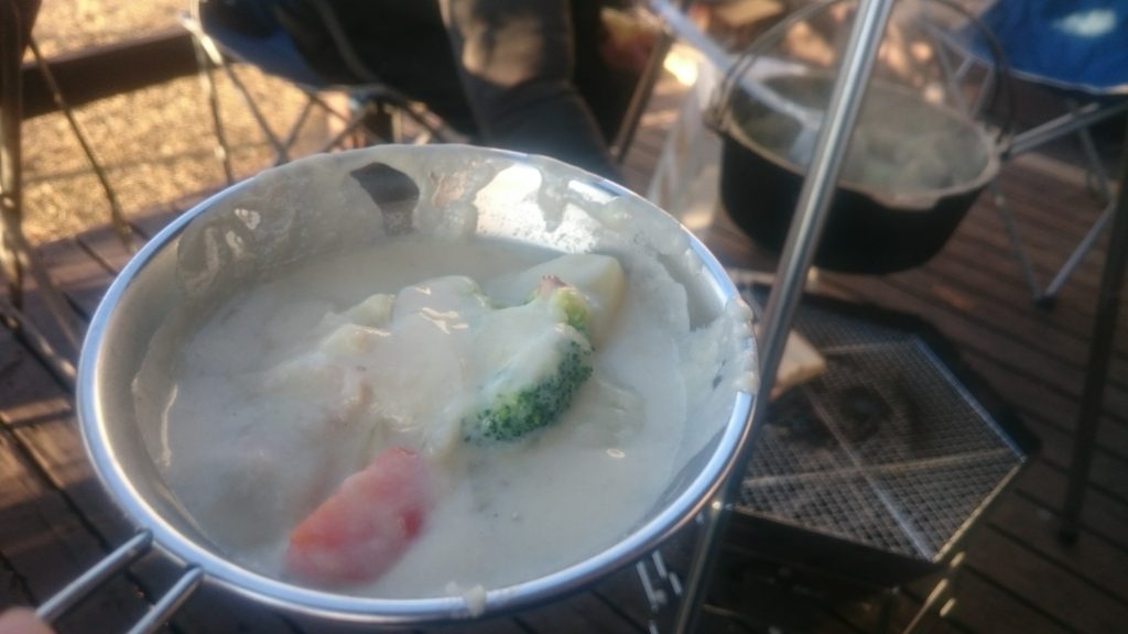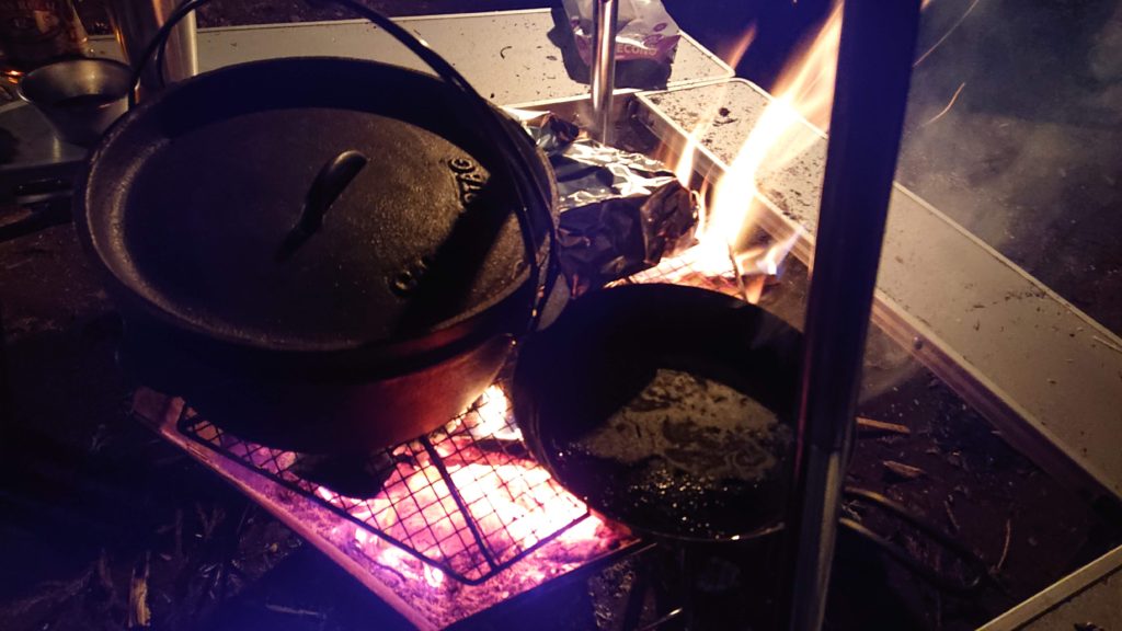 焚き火で料理をすれば、毎朝食べてるウインナーを焼くだけでもそれはもう本当に美味しいご馳走です。私の場合、はじめての朝は、レンタルしたダッチオーブンでシチューを作りました。