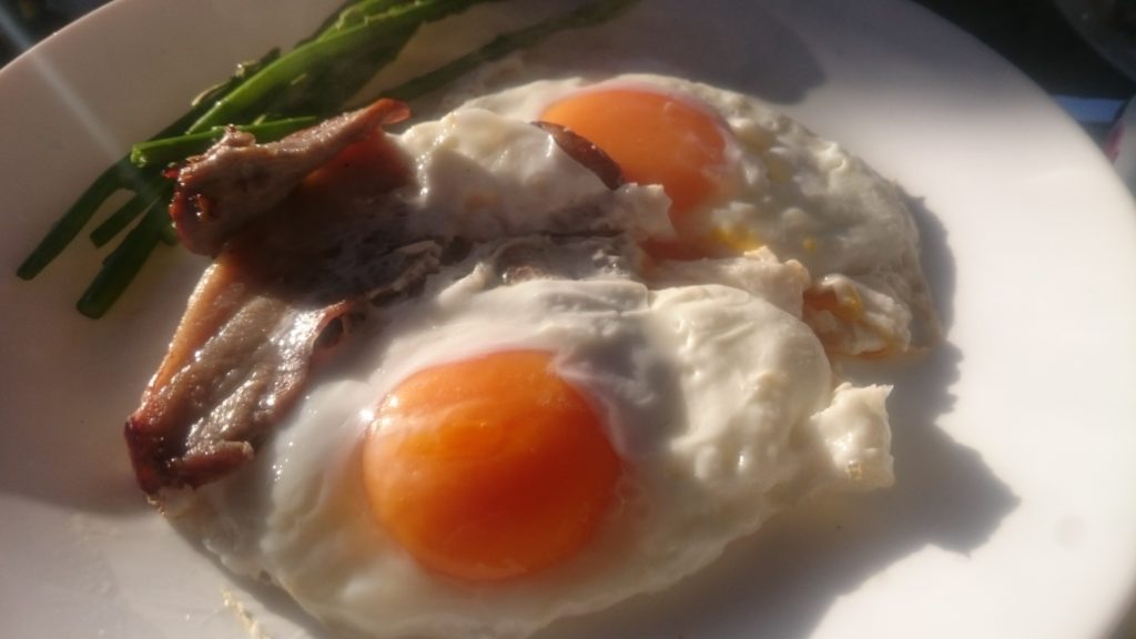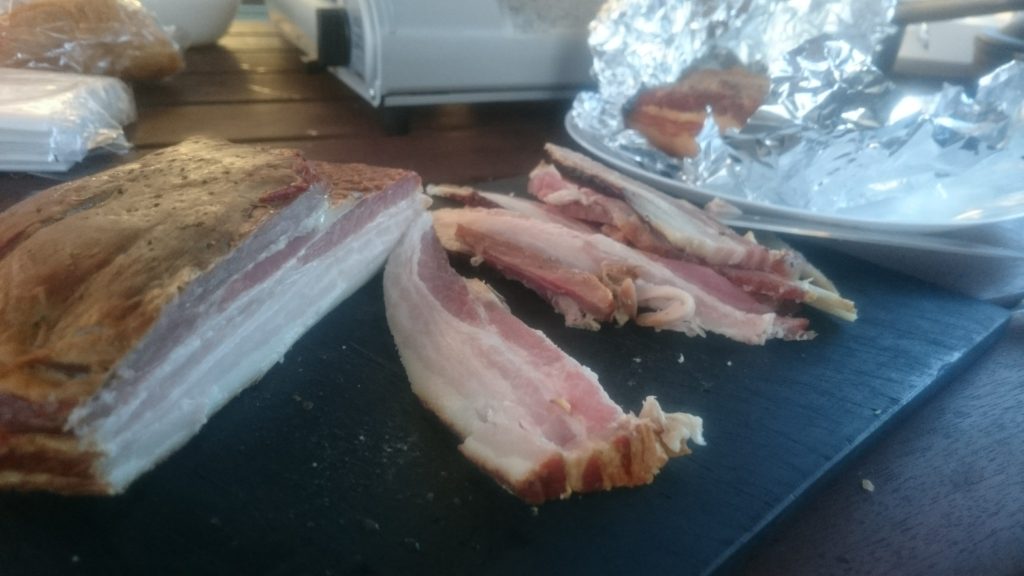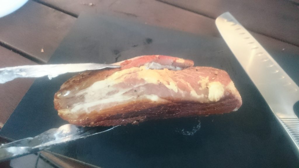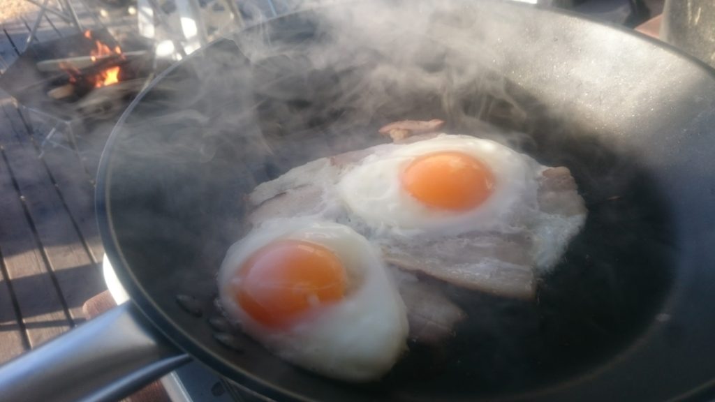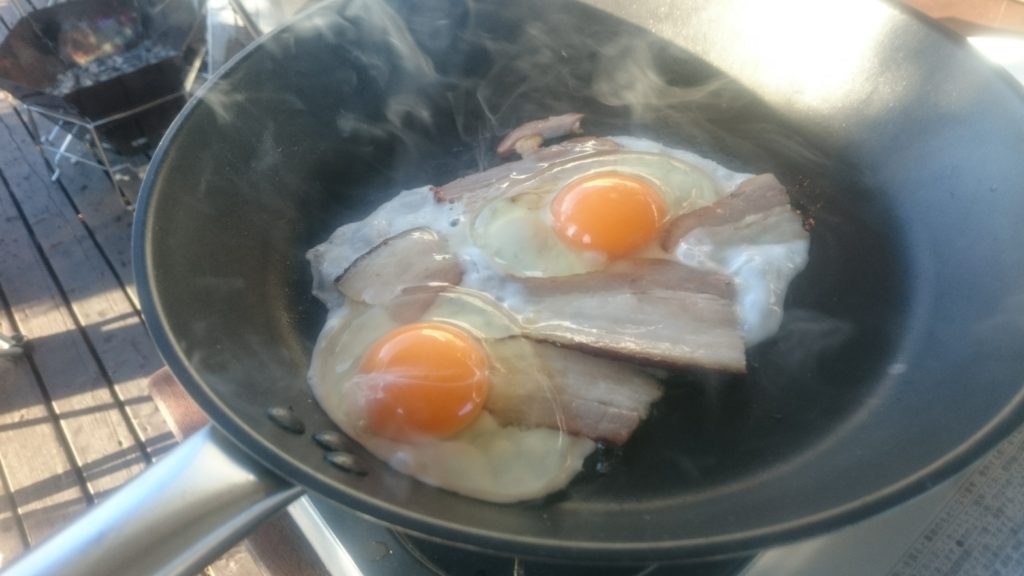 私は元々「料理」が趣味なので、焚き火とかとはまったく関係なく、自家製のベーコンを仕込んでいました。泊まったコテージには中にキッチンや調理器具や食器が備わっていたので、備え付けのフライパンとガスコンロでベーコンエッグを作りました。シチューで温まりながら、「豚肉の燻製」という表現が相応しい自家製ベーコンを使った朝食ときたらもう本当に最高でした。